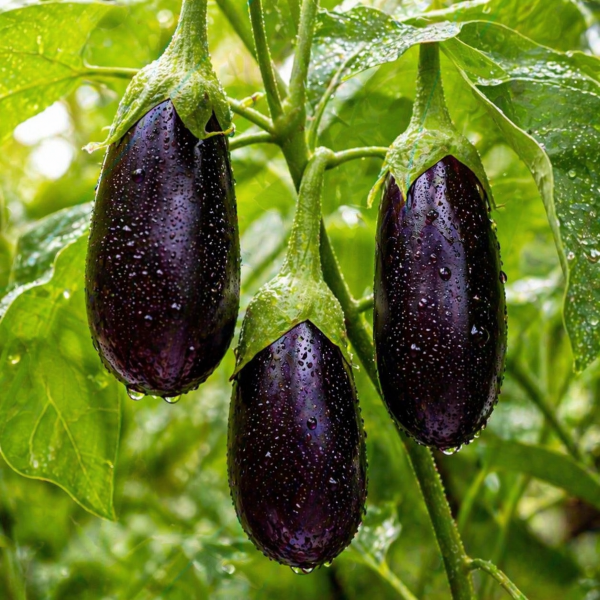 Plodovi so srednje dolgi, hruškaste oblike, privlačne vijolične barve.
