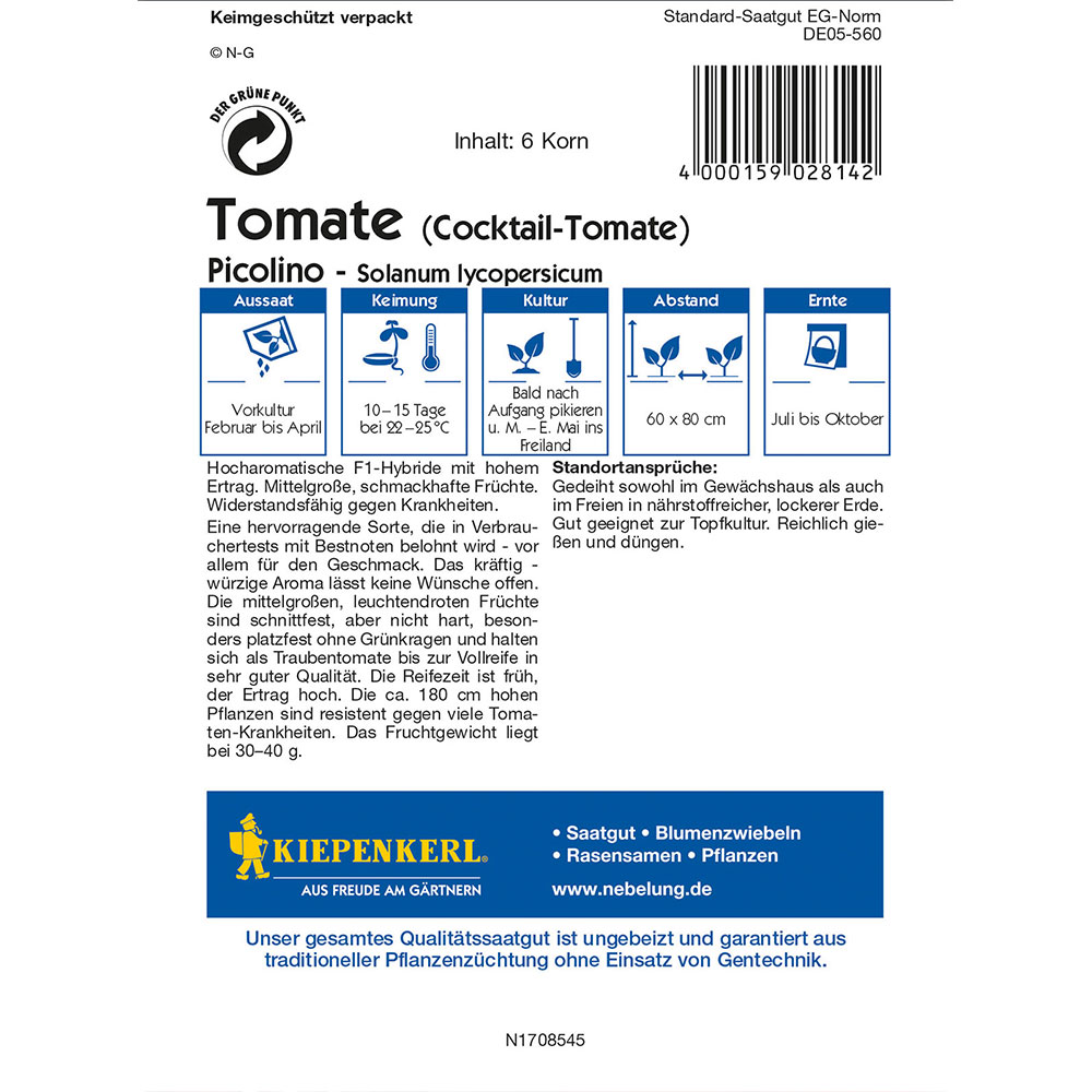 Vsebina paketa:1 kos Koktajl paradižniki Picolino F1 so močni, pikantni in zelo aromatični koktajl paradižniki z jasno rdečimi plodovi. Ta zgodnja in visoko donosna sorta paradižnika proizvaja plodove, ki tehtajo do 40 gramov in so v potrošniških testih prejeli najvišje ocene. Plodovi se seveda lahko uporabljajo na različne načine v kuhinji. So tudi prava poslastica, če jih jeste sveže. So čvrsti, odporni proti razpokam in nimajo zelenih delov. Kot paradižniki na trti ostanejo plodovi zelo dobre kakovosti, dokler niso popolnoma zreli. To bujno sorto je mogoče gojiti tako na prostem kot v rastlinjakih.