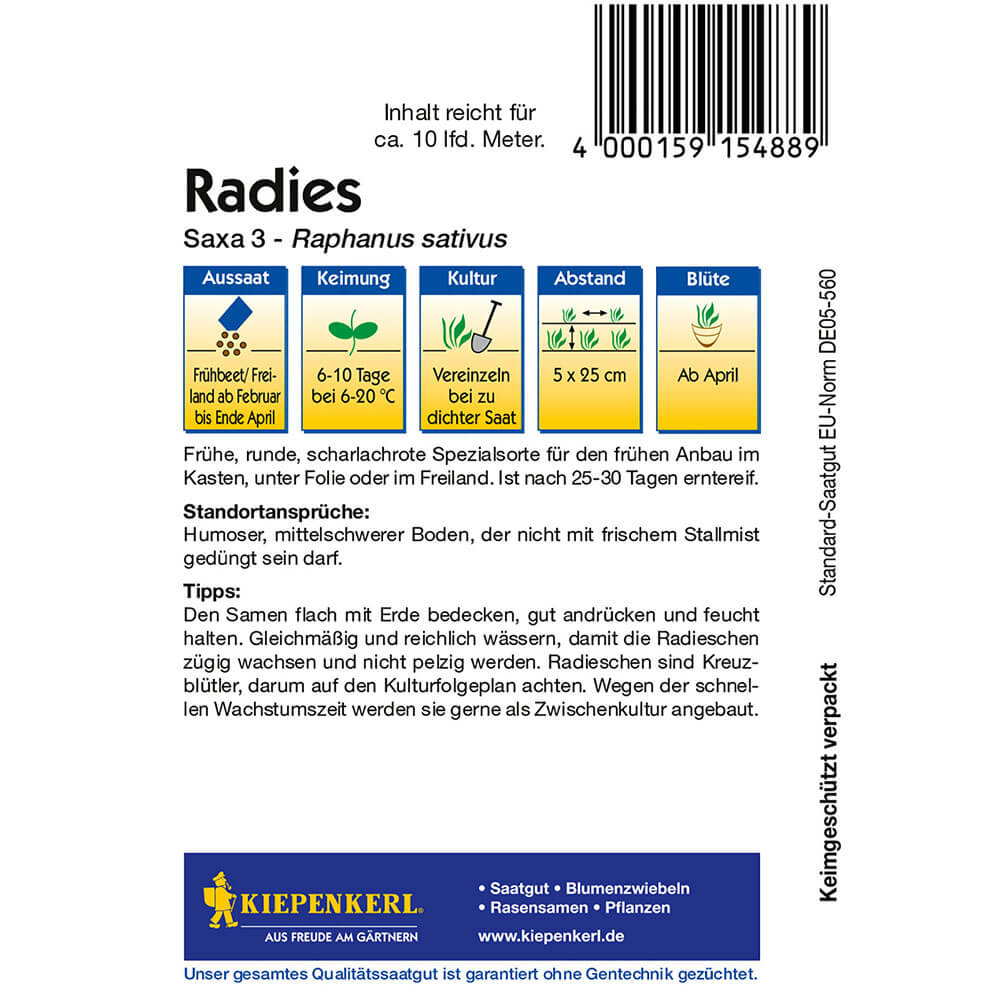 Vsebina paketa:1 kos Zgodnja, okrogla, škrlatno rdeča posebna sorta redkve za zgodnjo pridelavo v zabojih, pod plastično folijo ali na prostem. Pripravljena za spravilo v 25–30 dneh. 1 porcija zadostuje za približno 10 tekočih metrov na leto.