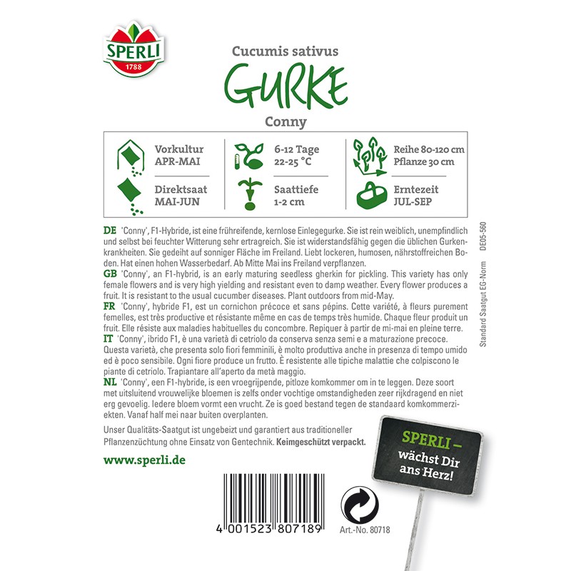 Vsebina paketa:1 kos Kumarica za kisle Conny F1 je zgodnja, brezsemenska sorta. Ne glede na temperaturo in vremenske razmere ta hibridna sorta, ki ima izključno ženske cvetove, daje visoke pridelke (vsak cvet da en plod), tudi v vlažnih in hladnih letih. Idealna za pripravo kislih kumaric in kumaric za kisle. Sorta je odporna na virus mozaika kumare, pepelasto plesen in kumarno krastavico. Idealna za gojenje na prostem.