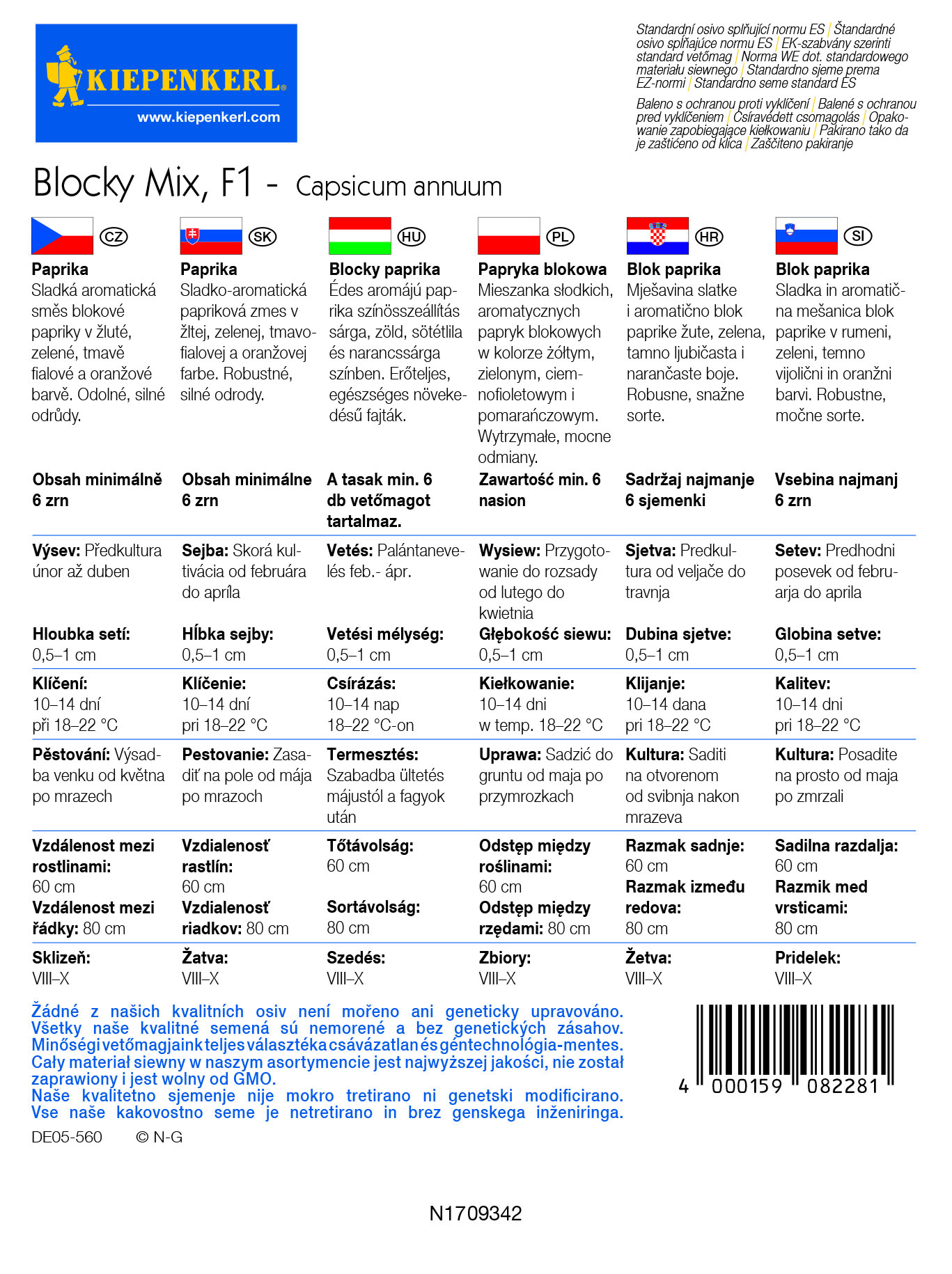 Vsebina paketa:1 kos Sladka, aromatična mešanica rumene, zelene, temno vijolične in oranžne paprike. Prava poslastica za oči in brbončice. Vijolična paprika »Mavras« je močna in pikantna, rumena paprika »Coletti« je sladka in aromatična, zelena paprika »Bendigo« je hrustljava in okusna, oranžna paprika »Milena« pa je nežna in sadna. Vse štiri hibridne sorte so odporne proti najpomembnejšim virusom paprike. Plodovi tehtajo približno 150–180 g. Višina približno 80 cm. (Paket vsebuje najmanj 6 semen.)