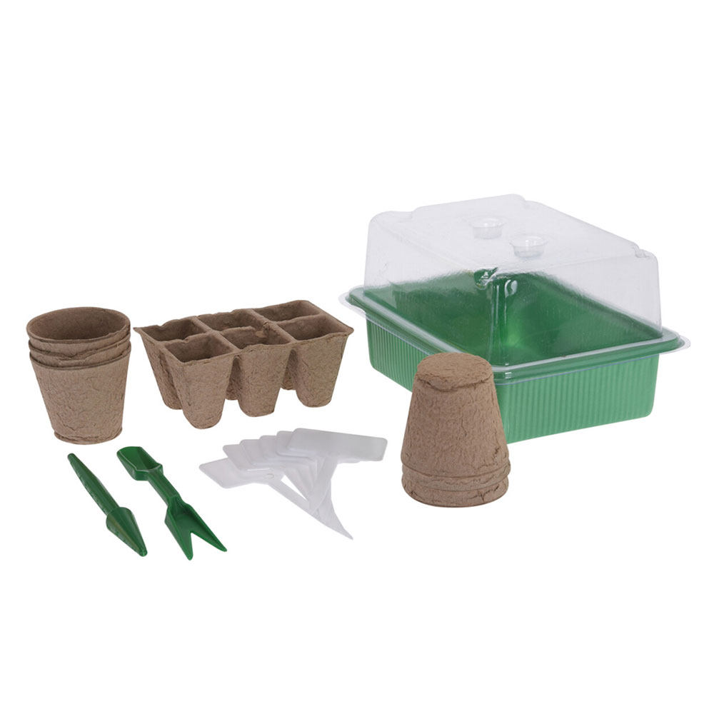 Vsebina paketa:1 kos A fiatal növényei sikeres neveléséhez. Mini üvegház, mérete kb. 20 x 6 x 14 cm, tetővel, 6 cseréppel, 1 tálcával, 6 címkével és 2 részes palántázó eszközzel.